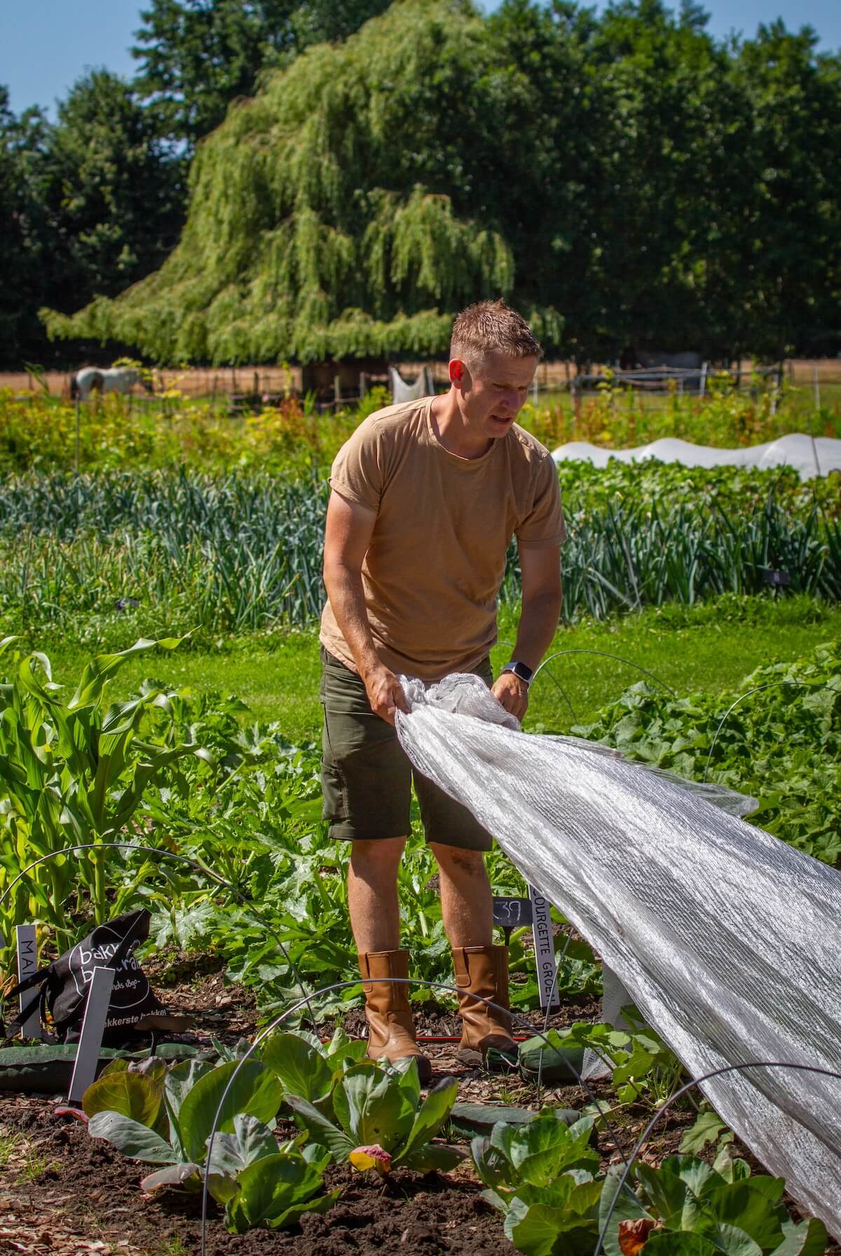 We telen op natuurinclusieve wijze zo’n vijftig verschillende groenten, twintig soorten kruiden, kleinfruit, appels en peren en een prachtige bloemenzee. We gebruiken geen kunstmest en schadelijke bestrijdingsmiddelen maar telen met zorg voor de natuur en de biodiversiteit. We besteden veel aandacht aan een gezonde bodemopbouw en behoud, dmv van groencompost, groenbemesters en zonder mechanische grondbewerking.
