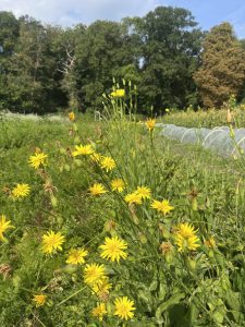 De schorseneren staan prachtig in bloei, we zaaiden spinazie, veldsla en groenbemesters deze week en haalden de kolen onder hun tentjes vandaan. Die beschermden ze tegen de rupsen van het koolwitje, maar de leg periode van deze vlinders is nu zo goed als voorbij.