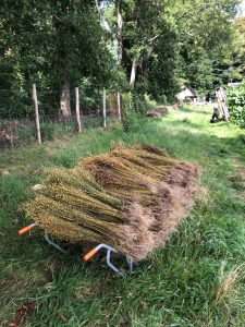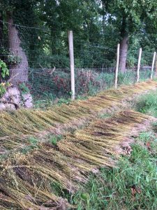 Afgelopen week hebben we het geoogste vlas buiten te roten gelegd. Dit roten (of dauwroten) zorgt ervoor dat de buitenste, harde stengel makkelijk los komt van binnenste vezels die gebruikt worden om linnen van te maken.