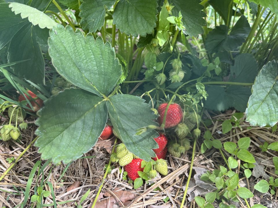 Ohja en de eerste aardbeien kleuren rood. er is nog niet genoeg voor een hele oogst maar proef er wel vast een!